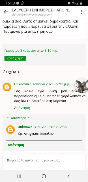 Γράφω στις 3 Ιουνίου :"Χρήστο Αναγνωστόπουλε σας γνωρίζω ότι το γραφείο τύπου του συνδυασμού σας που φέρει τον τίτλο όραμα αλλαγής δεν με κάλεσε στην ομιλία σας. Αυτό σημαίνει δημοκρατία; Και παράταξη που μπορεί να φέρει την αλλαγή; Περιμένω μια απάντηση σας "